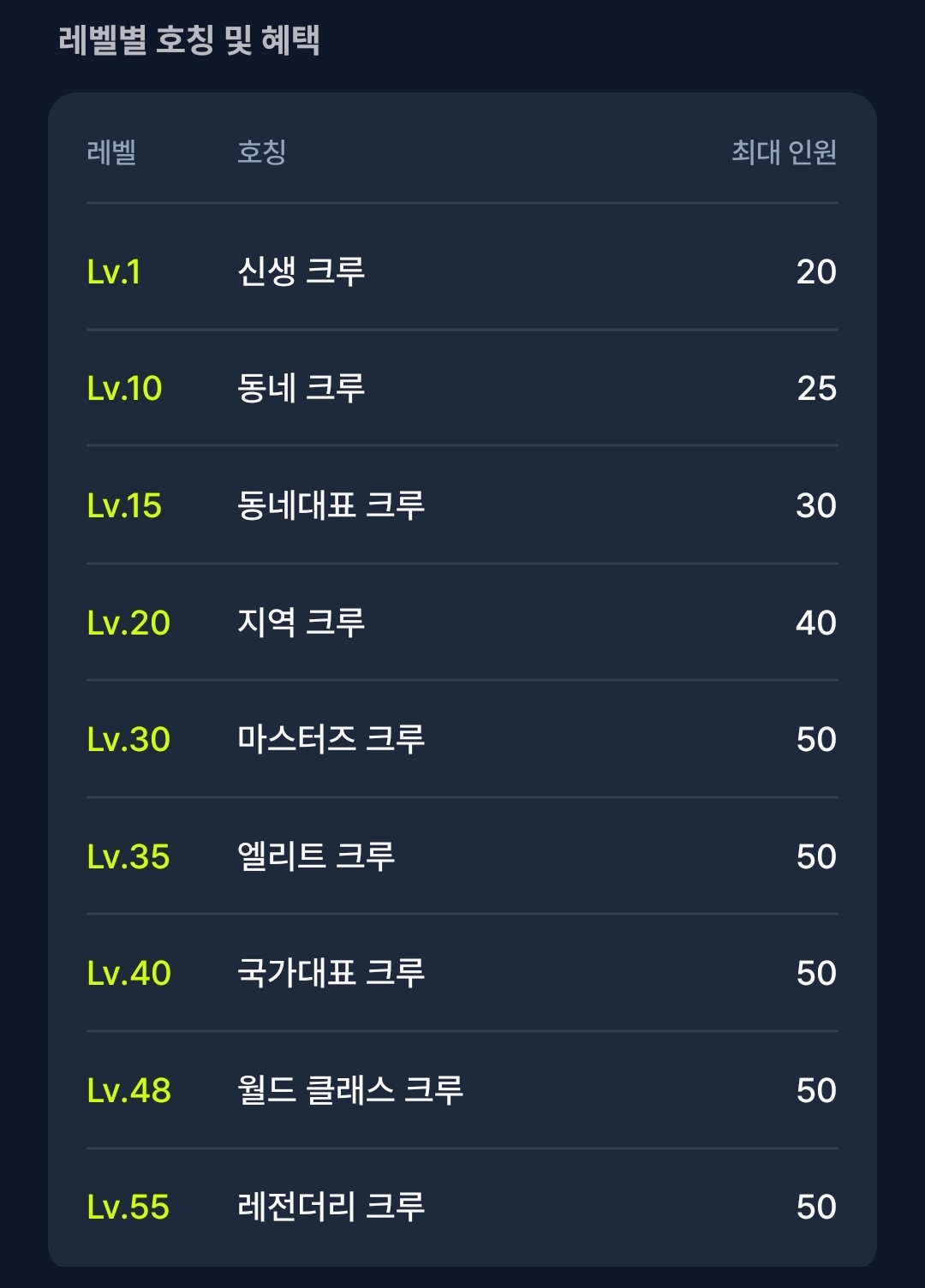 크루 레벨은 크루 경험치를 기반으로 하며, 레벨에 따라 호칭과 최대 인원수가 달라집니다.