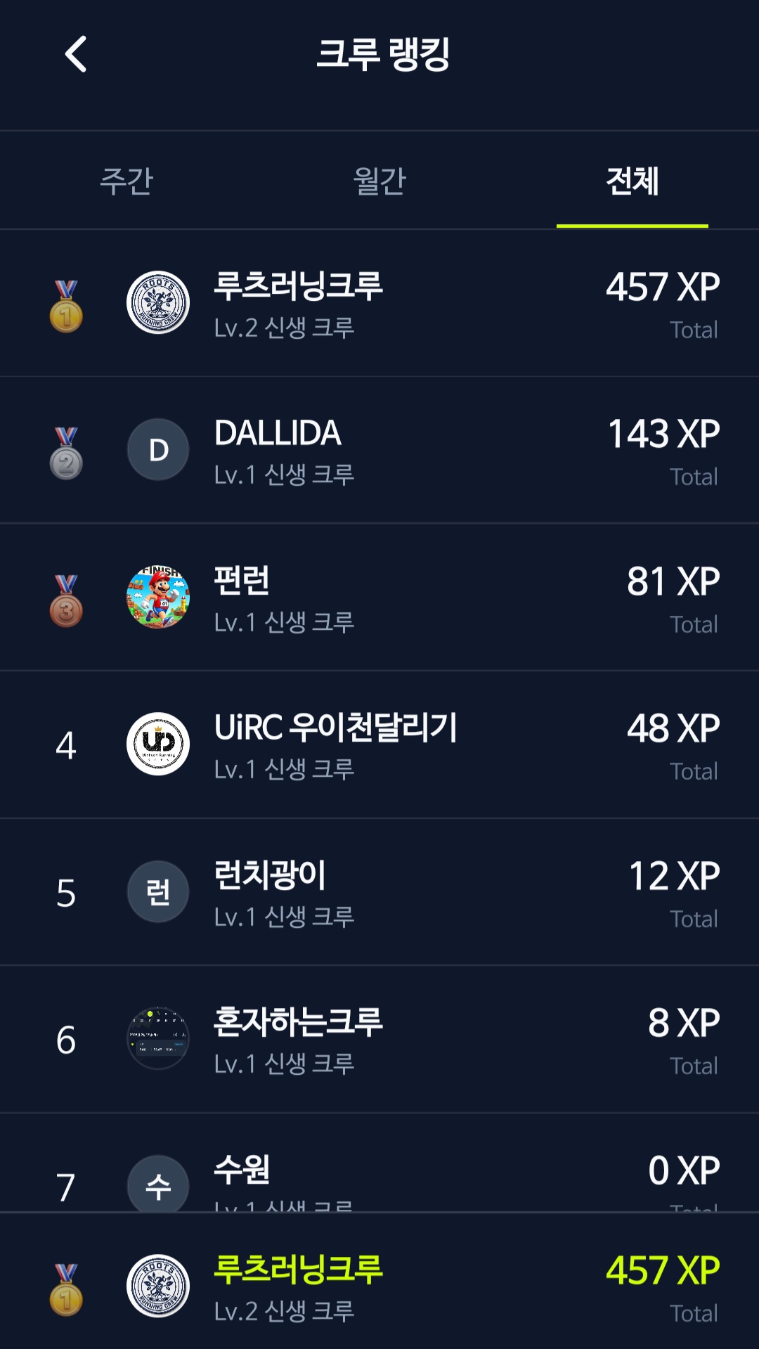 크루 랭킹은 크루 경험치를 기반으로 하며, 기간에 따라 주간/월간/전체 순위를 확인할 수 있습니다.